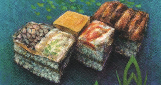 ▲箱壽司是大阪吉野壽司的第三代店主吉野家寅藏於明治二十年(西元一八八七年)始創。製作過程:在木模內依一層醋飯、一層香菇絲、一層醋飯的次序填入,接著將鯛魚、烤星鰻、蝦子、煎蛋排列其上,按壓緊實後倒出,再切割成適當大小。手藝精緻、形色皆美的箱壽司,因長度為七.八公分,而有「兩寸六分之懷石」的雅稱。