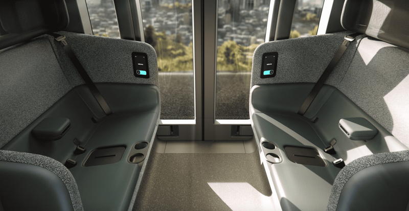 Zoox自駕計程車的車上除了有智慧型手機的無線充電版之外,座位旁還有觸控顯示螢幕,供乘客能夠察看行駛路線、當下位置、抵達時間等相關資訊。