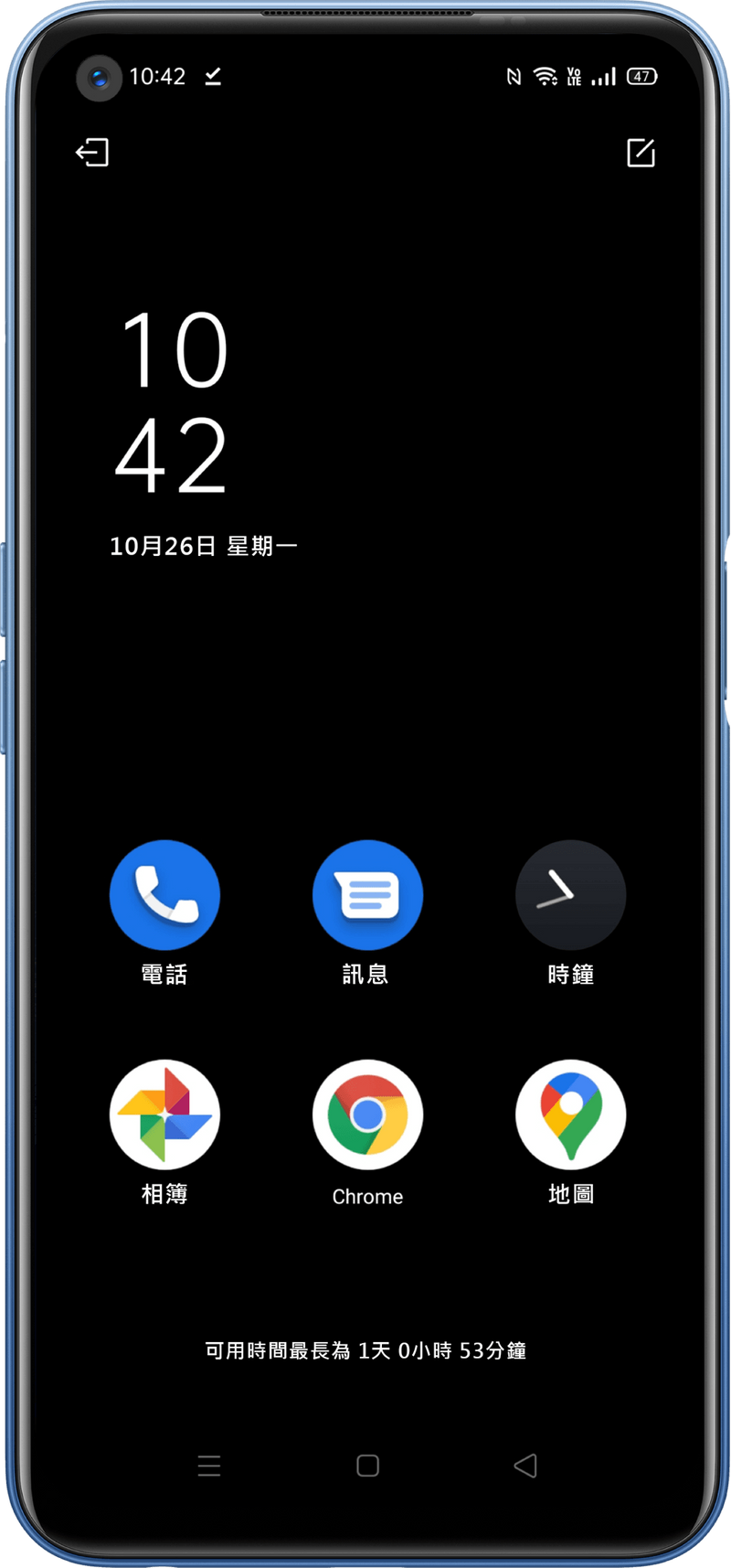 realme 7 5G具備5000mAh超大電量,可以連續待機長達25天、語音通話35小時,其支援30W Dart閃充,充滿電量僅需65分鐘。另外,若用戶開啟超級省電模式,即使手機電量僅剩5%,還是可以用Line聊天達77分鐘。
