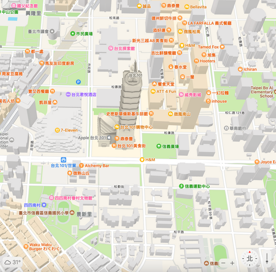 本次Apple地圖的更新重點就是正式在台灣推出「3D顯示」功能,使用者只要在Apple地圖中右上角的「選擇地圖」先切換成「衛星」,就會出現一個3D標誌。