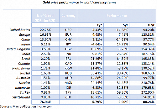 下圖顯示了金價在過去1年、5年、10年內以不同貨幣計價的表現。換言之,可以看到不同貨幣在過去數年的貶值幅度。