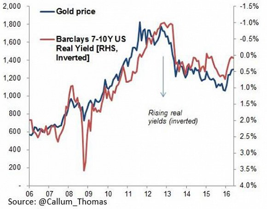 過去十年中,美國資產的收益曲線和金價走勢呈高度正相關關係。但當全球主權債券利率都日趨負值領域,情況會怎麼樣?