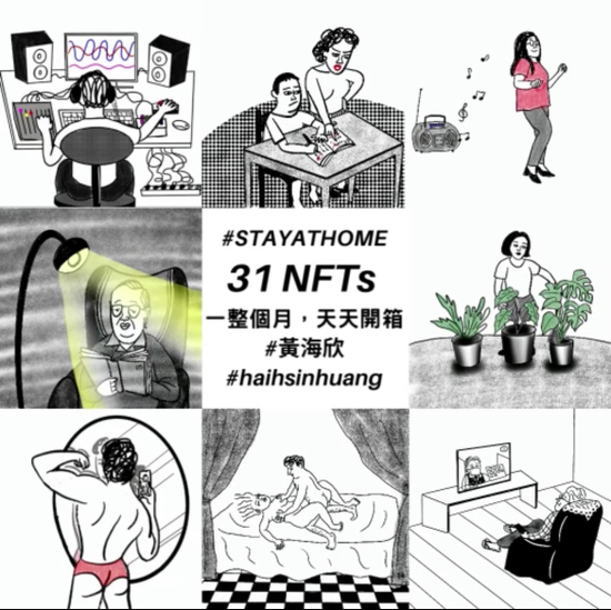 黃海欣的最新創作#stayathome,是她與NFT多元創意整合平台「SOYL所有」攜手,首次推出的NFT系列作品,總共發行100套,每套由31件循環動圖檔(GIF, 含配樂)組成。該系列將於5/20(五),台北當代藝術博覽會展期首日起,在大會所規劃的全新「藝動區塊 」線上展區,與三大國際 NFT 平台Art Blocks、Feral File、Outland,為了這屆台北當代藝博會特別推出的NFT藝術項目同步展出。