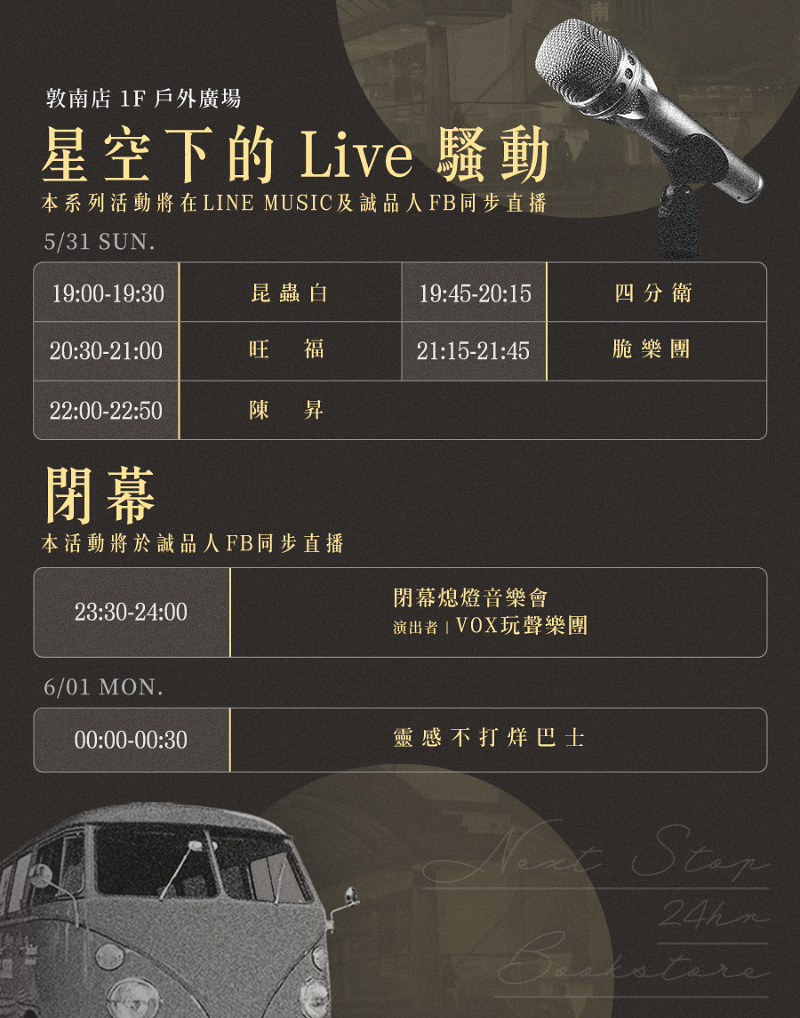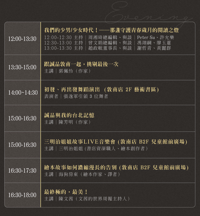 到了晚間,在戶外廣場也將有多名歌手及樂團輪番開唱,包括昆蟲白、四分衛、旺福及Crispy脆樂團,而最後則是邀請陳昇擔任壓軸演出,用音樂和觀眾們一同與敦南誠品說再見。