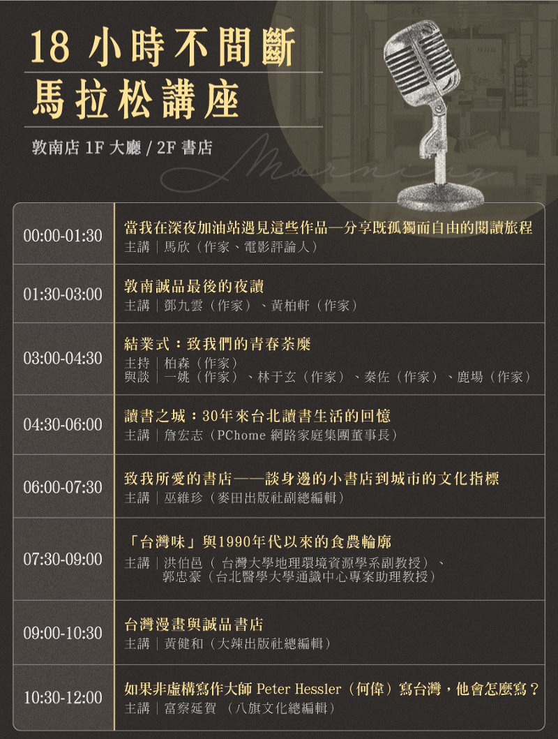 從5月31日的凌晨起,敦南誠品將展開18小時不間斷的馬拉松講座,不僅邀請許多作家、出版社總編輯及媒體人開講,中間也將穿插藝術表演,讓民眾可以在敦南誠品的最後一日留下特別的回憶。