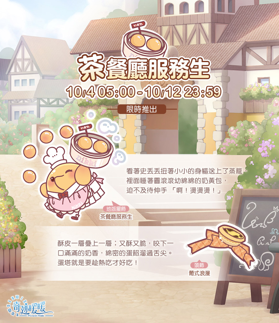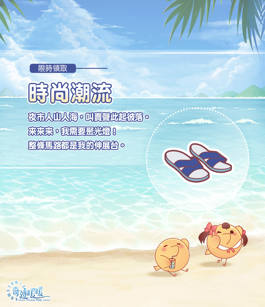 《奇迹暖暖》首次推出台灣在地化特色散件!可愛的史丟丟端著圓滾滾幼綿綿的奶黃包、蛋塔小妹特製的蛋塔頭飾,以及台灣人最熟悉的藍白拖皆於本次更新中登場。不僅如此,官方更預告近期將於粉絲團舉辦活動,搭配師有機會獲得台灣國民鞋藍白拖「時尚潮流」散件。欲了解活動詳情,請密切鎖定官方粉絲團。