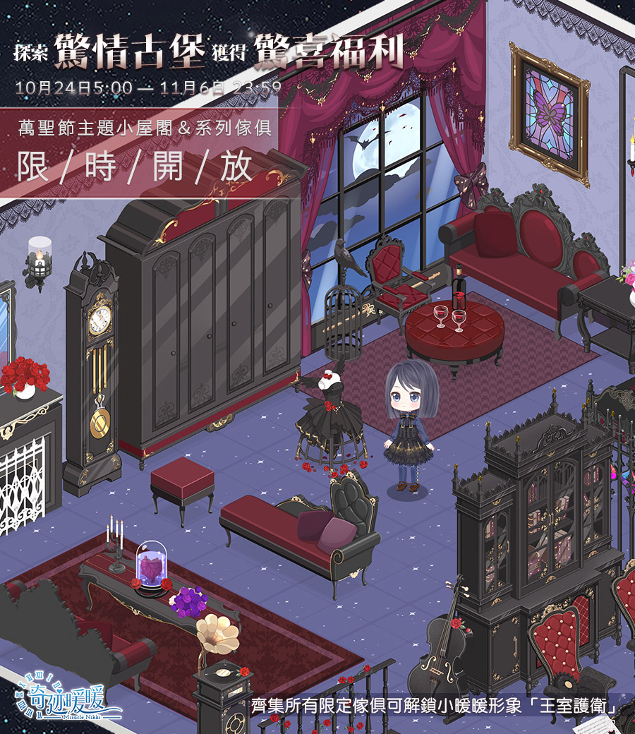 萬聖節即將來臨,《奇迹暖暖》預告將為搭配師帶來驚喜連連的萬聖節系列活動!羅伊斯國王陛下於10月24日至11月6日將在黑卡家中舉辦萬聖節的化裝舞會,活動期間搭配師將會收到黑卡的邀請函,應邀拜訪即可前往「驚情古堡」,探索黑卡家還有機會觸發神秘事件,獲得驚喜小禮!完成特定條件更能解鎖小暖暖形象「王室護衛」。