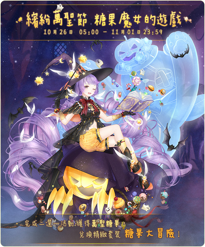 「繽紛萬聖節」活動於10月26日起舉辦至11月1日,搭配師參加萬聖慶典二選一活動可獲得萬聖糖果,收集特定數量的糖果將能兌換萬聖節限定套裝「糖果大冒險」,找回被換走的大喵。