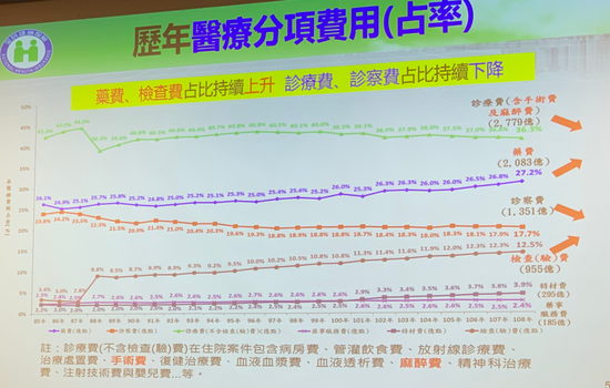 再從整體健保支出項目來看,從民國84年實施至今,整體趨勢是藥費、檢查費佔比都持續上升,至於診療費、診察費佔比則在下降。其中檢查費的佔比增加很明顯,從健保實施以來的3.4%增加至12.5%。(見下圖)