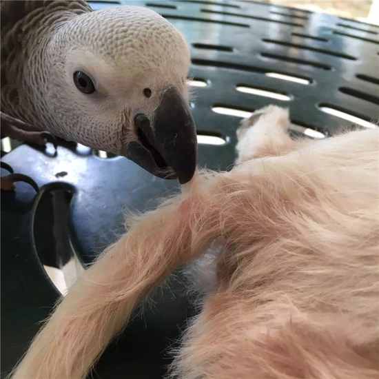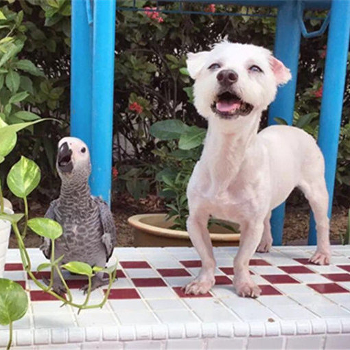 沒想到一周後兩人就熟了,於是鸚鵡開始追著喜喜咬它的尾巴了,有一次不知輕重還把喜喜的尾巴咬出血。