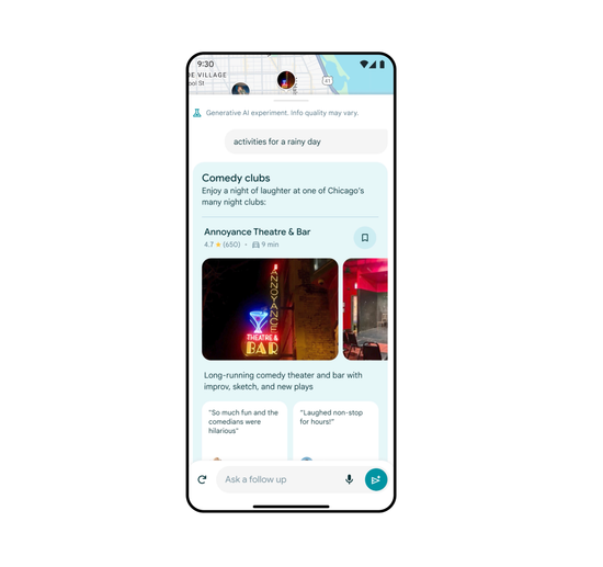 除此之外,若用戶需要突然改變計劃這些人工智慧驅動的結果也會派上用場,像是用戶在外出時開始下雨,只需要向地圖詢問「雨天的活動」即可取得室內活動的建議;若正在找尋適合全家人活動的地點,用戶則可能會看到保齡球館、兒童博物館或室內遊樂場等地點,以及基於去過那裡的人的評論。