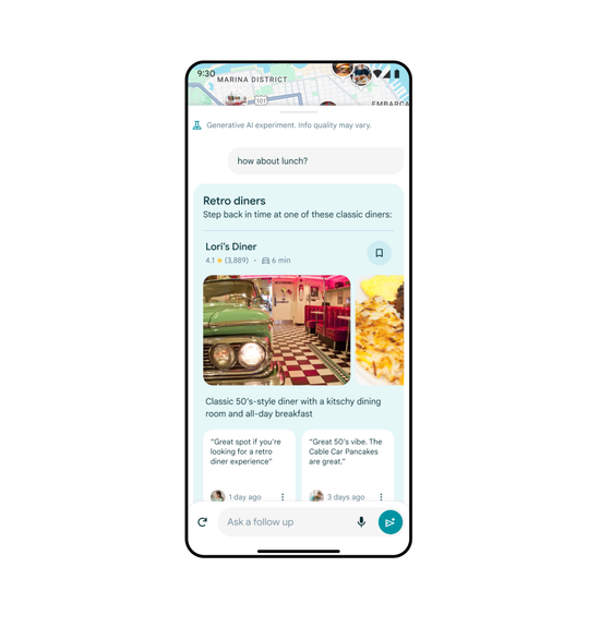 若用戶還想進一步找尋美食,並讓原本設定的復古氛圍持續下去,那就可以向Google Map提出「午餐如何?」這時地圖系統就會推薦與用戶正在找尋的復古氛圍相符的地點,例如附近的老式餐廳。