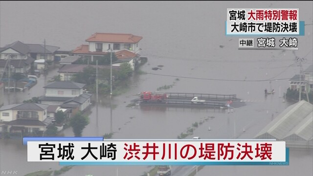 根據蘋果日報報導,艾陶颱風到日本轉變為溫帶低氣壓後,造成關東和東北地區豪雨成災!栃木縣破了50年來的最大降雨量,導致當地的鬼怒川潰堤,造成當地大淹水。今天再度傳出宮城縣的澀井川也潰堤,多人受困求救。根據日本《NHK》報導,澀井川潰堤後,當地多處地方大淹水,當地政府緊急疏散1千人。日本氣象廳今也對宮城縣發布大雨特報,指出宮城「正是面臨重大危險的異常狀況」。另外,鬼怒川潰堤後,茨城常總市的東半部完全被淹掉,更傳出截至目前為止有22人失蹤,並有7千民宅被淹。