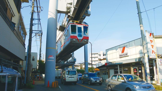 ▲江之島站旁的湘南電車,為少見的懸掛式單軌電車