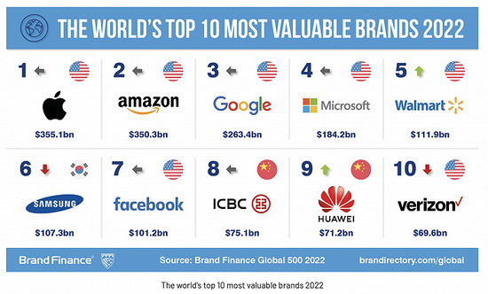 第二和第三名分別為亞馬遜(3503億美元)和谷歌(2634億美元)。而微軟以1842億美元位列第四,排在第五位的是沃爾瑪,價值為1119億美元。