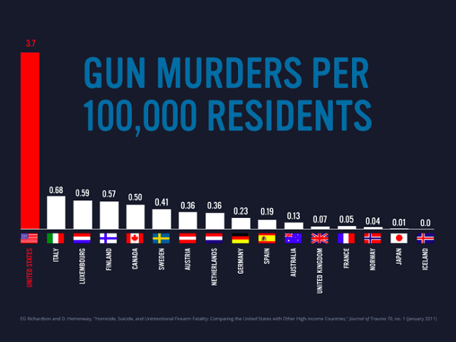 這張圖片中的數值代表各個已開發國家中,十萬人中會有幾個人死於槍殺,可以看出,相較於其他國家,美國槍枝氾濫的問題已對國民安全造成威脅。
