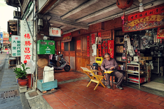 (坐在門口籐椅上,吹著老街穿過亭仔腳的風,楊仔從商場回到最熟悉的鄰里小買賣。)