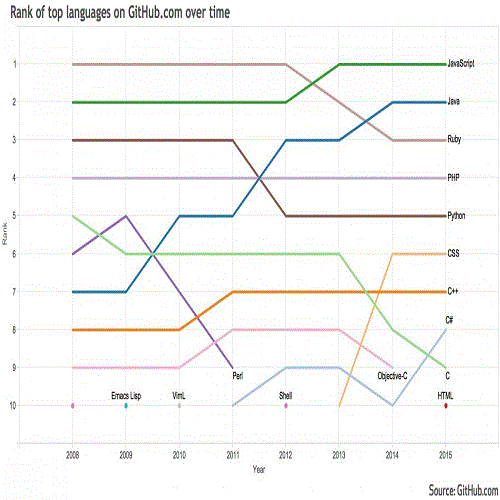 第二名 Java : 1991 年為了開發智慧電視而誕生,甲骨文的 Java 是目前世界上最熱門的程式語言,加上 Java 對於 Android 應用程式和商業軟體的重要性,在在都強化了 Java 程式的地位。同時它也是世界上擴張最快的語言,根據 Github 的網站統計 Java 在 2009 年還只是第七名。