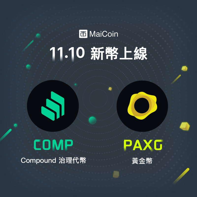 有鑒於民眾對去中心化金融 (DeFi) 接受度漸增,虛擬貨幣買賣平台 MaiCoin,繼十月份上架了 DeFi 熱門代幣 Dai、LINK,緊接著再於11月10日上架同樣具話題性的 DeFi 代幣 COMP,並且同時上架了錨定黃金價格的 PAX Gold。
