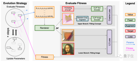 它會對ES算法給出的三角形圖像與文字描述的相似度進行打分,然後將結果反饋給ES算法,ES算法就會為了提升分數而不斷迭代,最後得到一副藝術畫。