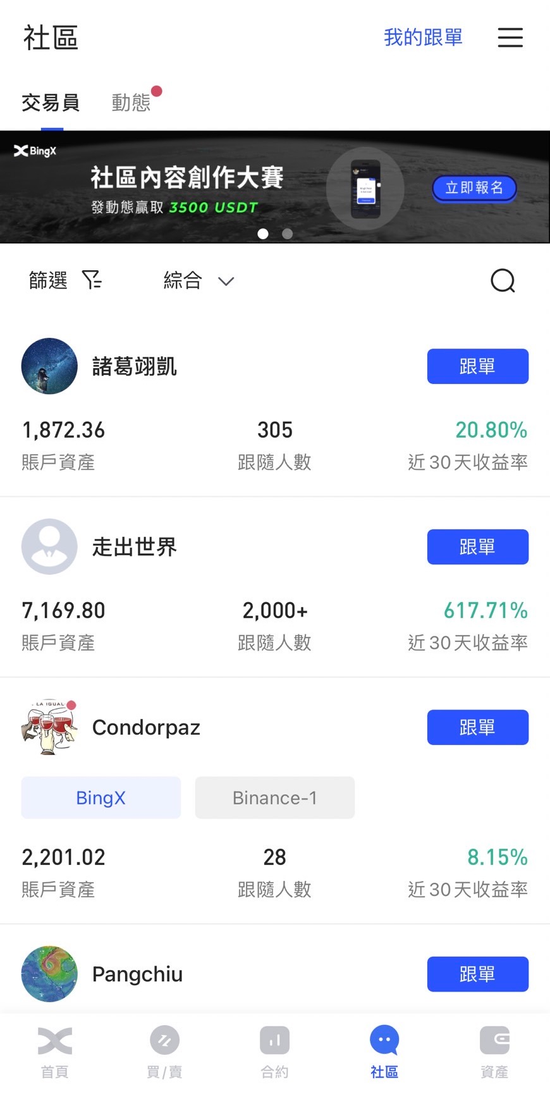 陸一萱解釋,原本Bingbon就有提供跟單系統及專業合約、標準合約等服務,而這也創造了兩種角色,像專業合約是給原本已經有在做合約交易的人所習慣使用的,而這種人則可以在平台上擔任交易員,讓沒有加密貨幣投資經驗的人跟單。