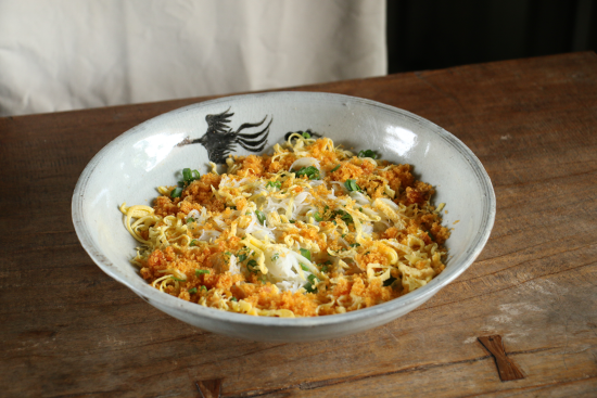 另一道黃金美人腿米粉從食材組成到呈現,徹徹底底顛覆了傳統炒米粉的模樣。以茭白筍絲和蔥為炒米粉的配料,是清淡不油膩也不複雜的組合。最後,僅撒上蛋絲與烏魚子末,做為鹹味與鮮味來源。烏魚子磨成細粉的過程,刨末器具不一會兒就沾滿油脂,便知道這經過風乾熟成的烏魚子除了鹹、香、黏之外,也富含誘人的油脂。最好要吃之前才撒烏魚子,也要即早將米粉拌開拌勻,才會確保烏魚子末不會遇熱遇溼而結成塊狀。