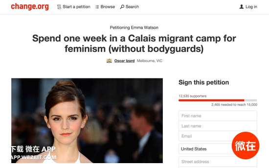 這兩天艾瑪華森被出了個大難題。一個澳洲的社會活動家在一個請願網站上發起了一個請願,內容是讓艾瑪到法國加萊難民營待一個禮拜,不帶保鏢。用行動向全世界證明,歐洲難民有多安全無害,多支持女權主義。這份請願書現在已經有14,300多個支持者了。