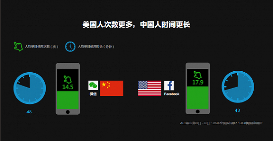 這次調查首次引入了手機行為數據分析。以微信和Facebook為例,調查結果顯示,美國人使用社群媒體的次數更多,但中國人使用的時間更長。