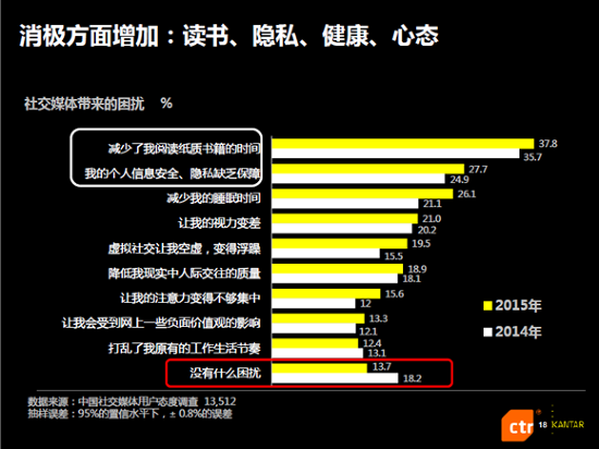 在社交媒体带来的困扰中,“减少了阅读纸质书籍的时间”“安全、隐私缺乏保障”“减少睡眠时间”“视力变差”“让自己变得空虚浮躁”占据了前五位。认同这些困扰的人群比例,与2014年相比也在上升。同时,认为社交媒体对自己没什么困扰的人群从去年的18%下降的到了14%。