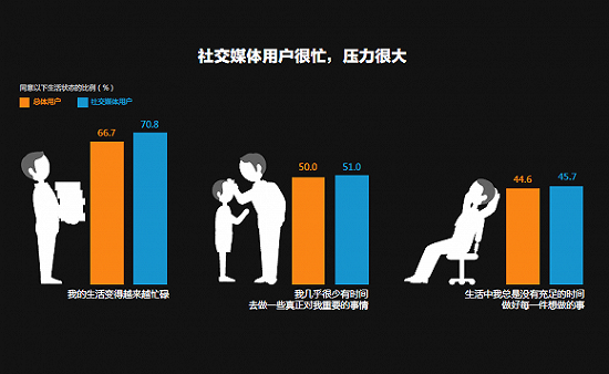 社群媒體用戶也更加忙碌,生活壓力更大。有67%的中國城市居民認為「我的生活變的越来越忙碌」,而在社群媒體用戶中,這一比例高達71%。社群媒體用戶也更加認同「自己幾乎很少有時間去做一些真正重要的事」和「生活中總是沒有充足時間做好每一件想做的事。」