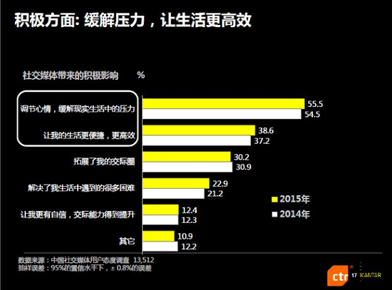 社群媒體當然也有積極的方面。「調節心情、緩解壓力」是它最大的好處,2014年和2015年認同這一點的人數都超過了一半。排第二、三位的積極影響是「讓生活更便捷高效」「拓展交友圈」。