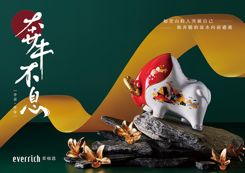 今年昇恆昌以「奔牛不息」為名推出牛年瓷罐禮盒,選用充滿年節氣氛的富貴紅搭配開運金,取「奔流不息」諧音,並以永不止息的堅毅精神作為設計主軸,將聳偉山脈稜線融入牛背,以磅礡瀑布勾勒牛頭,如奔騰流水般勇往直前,並能精誠所至金石為開,沖刷出純金牛角,開啟嶄新的一年。