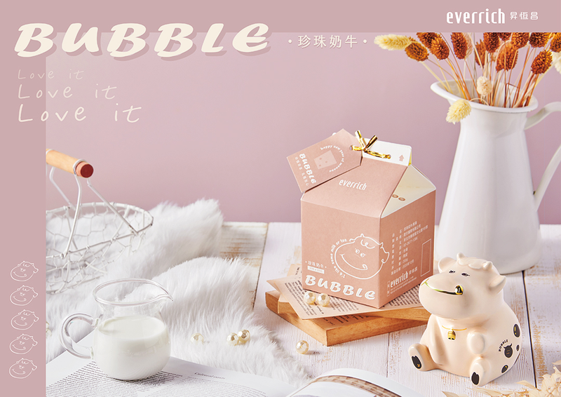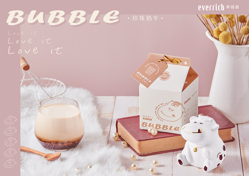 台灣最廣為人知的特產非珍珠奶茶莫屬,也一直位居手搖飲排行榜冠軍,昇恆昌以珍珠奶茶延伸設計兩款珍珠奶牛造型撲滿,全白的鮮奶款和杏色的奶茶款都可愛度破表,珍珠象徵吉祥、圓滿,更有珍視、珍貴的寓意,微笑的奶牛身上佈滿QQ的珍珠,不僅具有台灣意象,更增添了許多趣味。珍珠奶茶是台灣人的驕傲,以「珍珠奶牛」撲滿表達真情真意,牛年就用最道地的台味祝福送給最珍視的人。