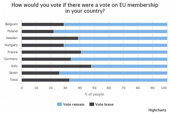 調查機構Ipsos MORI對歐元區多個國家的民調結果顯示,48%的義大利民眾願意投票支持義大利離開歐盟。一些對歐元持懷疑態度的政黨,如五星運動黨、北部聯盟黨等,也正在獲得更多的支持。