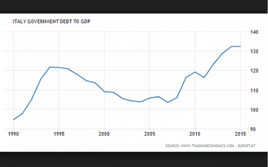 歐元貶值,廉價石油和歐洲央行的量化寬鬆政策的三重施壓下,2015年義大利債務佔GDP比重已經上升到132.7%。IMF預計的2016年義大利GDP成長僅為1%。