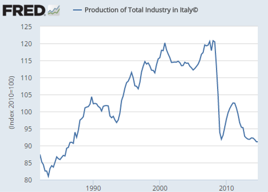 為避免災難性的去工業化,離開歐盟,或許是義大利最後一根救命稻草。2008年以來,義大利工業產出下滑35%至1980年代水平,工業投資亦減少了59%。