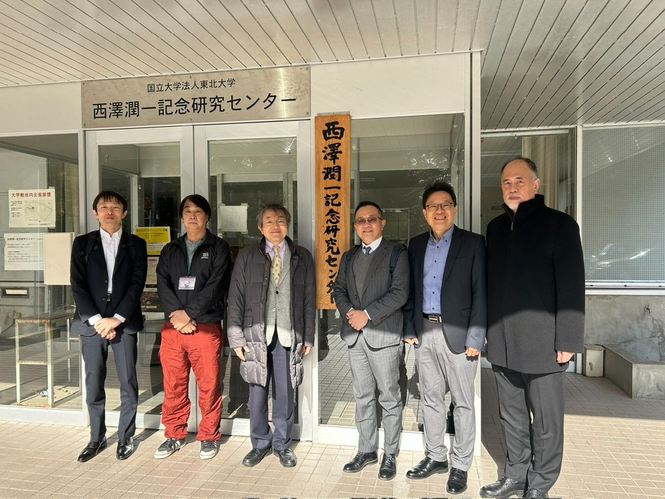 圖說:筆者林宏文(右二)參訪東北大學西澤潤一紀念研究實驗室,與Ballwave公司策略長塚原祐輔(左三)、達盈創投董事長方頌仁(右三)及達盈日本代表今野壽昭(左一)等人合影。(達盈創投提供)
