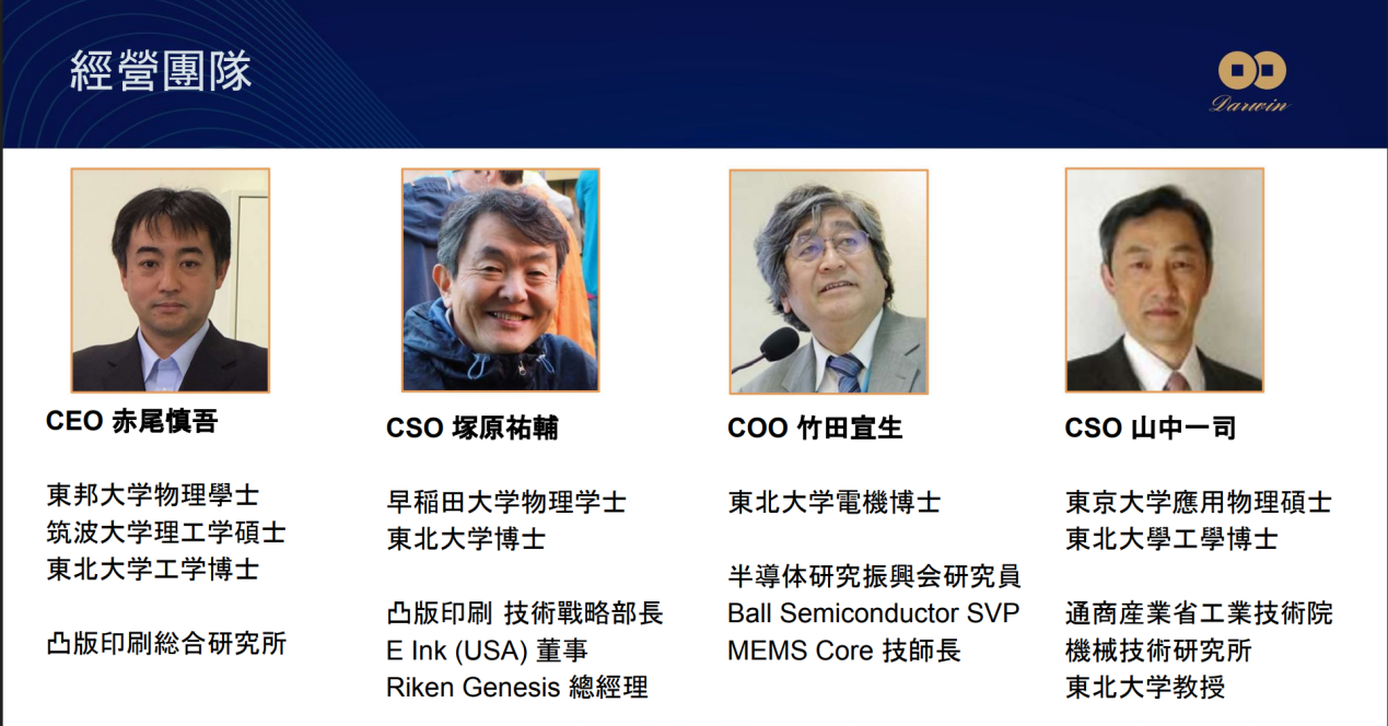 Ballwave公司成立於2015年,技術是從東北大學實驗室發展出來,四位共同創辦人赤尾慎吾、塚原祐輔、竹田宣生、山中一司都是東北大學博士。公司衍生初期由東北大學基金投資,後續取得日本Daiwa CVC、Real Tech、Sysmex、IMM,還有來自台灣的芯動能、工研院ITIC、達盈創投等的投資。(如下圖,達盈創投提供)