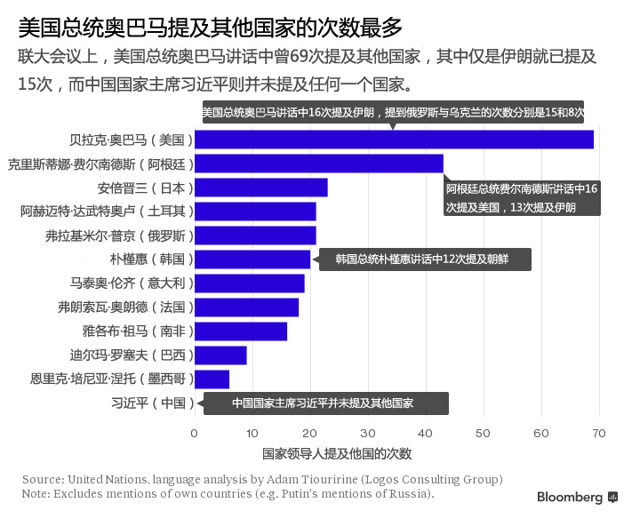 分析方法說明:為了出席此次聯合國大會,有英文發言稿的領導人包括:巴西總統迪爾瑪·羅塞夫,中國主席習近平,美國總統奧巴馬,俄羅斯總統普京,韓國總統朴槿惠,南非總統祖瑪,日本首相安倍晉三,土耳其總理艾哈邁德·達武特奧盧。有現場英文翻譯文本的領導人包括:法國總統奧朗德,墨西哥總統恩里克·培尼亞·涅托,阿根廷總統克里斯蒂娜,意大利總理倫齊。
