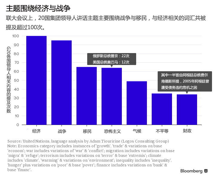 以下是彭博社策劃,與來自商標諮詢公司(Logos Consulting Group)的領導力溝通顧問Adam Tiouririne合作,對G20國家領導人聯大發言的匯總分析。