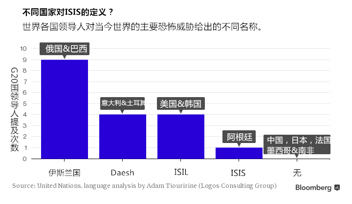 ISIS,伊斯蘭國(Islamic State)還是ISIL?對於控制了敘利亞和伊拉克大部分地區的極端組織,我們該如何稱呼?20國集團沒有達成一致意見。俄國首相普京使用了Islamic State,總共提及了8次。美國總統奧巴馬用ISIL,但在發言中使用這個名稱僅有3次。而意大利總理倫齊傾向於使用Daesh,在發言中同樣有3次提及,因為這是該組織阿拉伯名稱的首字母縮寫。
