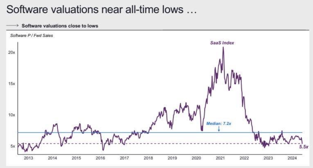 根據美國SaaS Index的指標來看,美國整體SaaS的P/S(Price/Sales,股價營收比),在新冠疫情發生的2021年達到20倍最高點後,就一路往下滑,到了2024年後,已跌到5.5倍。(見圖)