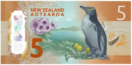 紐西蘭儲備銀行去年10月發行了新的5元和10元紙鈔,這也是該國「鮮亮紙鈔」(Brighter Money)計劃的一部分。新版5元紙鈔的一面印著登山家愛德蒙.希拉蕊(Edmund Percival Hillary)面朝南島庫克山,另一面則是罕見的黃瞳企鵝和本地花卉。