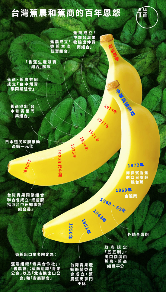 1914年,台中的蕉商成立「中部臺灣果物輸出仲買商組合」(次年擴大改組為「中部臺灣青果物輸出同業組合」),以同業公會組織,避免惡性競爭;但在1917年,員林、北斗與台中等地的蕉農之間出現「反(蕉商)壟斷」聲浪,相繼組成「香蕉生產販賣組合」,主張農民自產自銷。