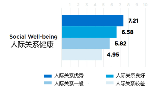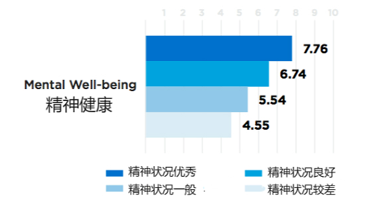 人際關係健康取決於員工是否掌握工作生活平衡、是否在工作中和生活中有高品質的、積極的人際關係;精神健康則和員工的正面心態、抗壓能力、使命感和對企業價值的認同有關。人際關係健康狀況和精神健康狀況的提升都能促進整體身心健康的進步,值得注意的是,精神健康狀況對整體身心健康的影響最大。數據顯示,擁有優秀精神健康狀況的員工整體身心健康指數高達7.76分,比擁有優秀身體健康狀態的員工和擁有優秀人際關係健康的員工分别高出1.1分和0.55分。