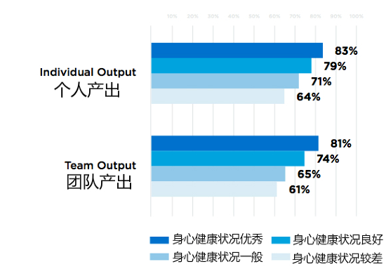 對於企業來說,身心健康呈現最佳狀態的員工無論是在個人工作還是團隊工作中都能夠做出最大貢獻。報告數據顯示,和那些身心健康狀況較差的員工相比,身心健康狀況優秀的員工在個人工作產出和團隊工作產出中分别高出19%和20%。除了工作更賣力之外,這些員工也往往能夠呈現更好的工作狀態。他們思維更敏捷,更有合作精神,能提出更有創意的問題解決方案,並有更強的執行力。