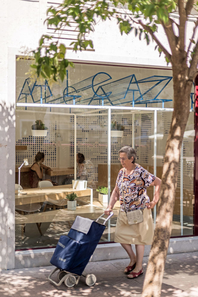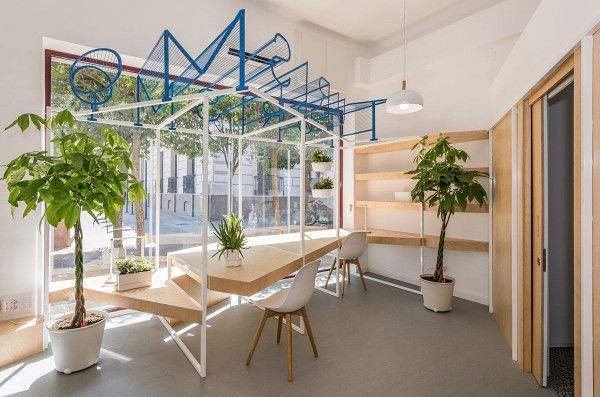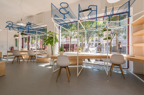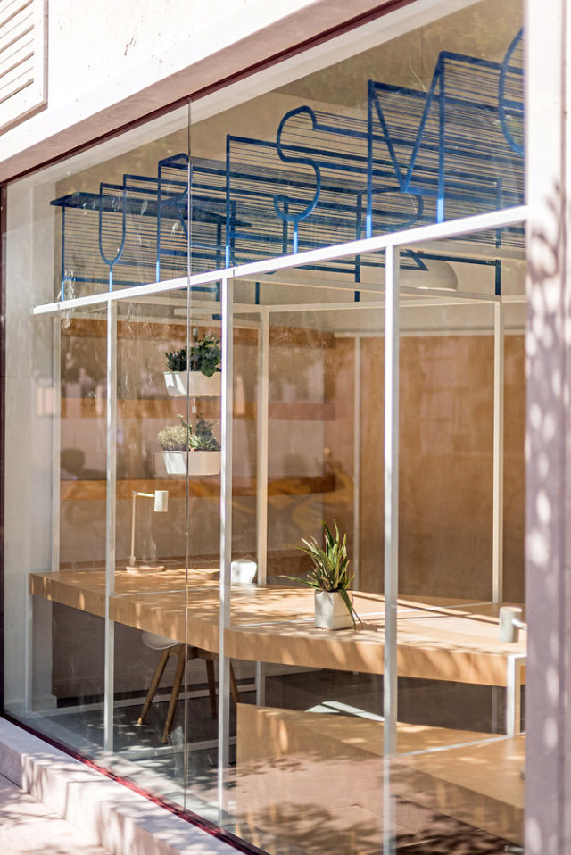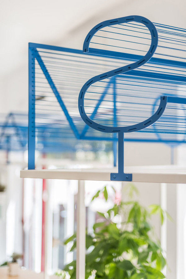 藍色字母、淺色木桌和白色的鐵架形成對比,顯著奪人目光