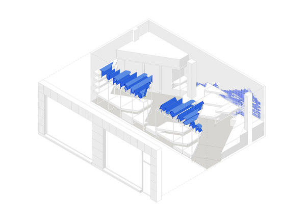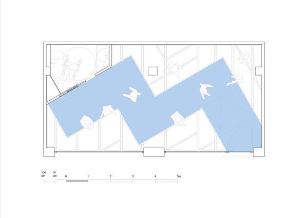 房間的另一面,靠著牆擺放不規則的木制長椅,它們也像階梯一樣排列,裝飾了牆面。人們可以在上面談心聊天,非常隨意。