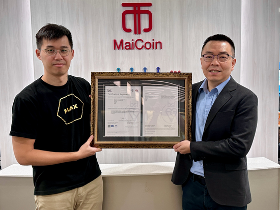 圖說:MaiCoin 集團旗下 MaiCoin 平台與 MAX 交易所通過 ISO 27001 資安驗證 (左起MaiCoin 集團資安主管林劭謙、MaiCoin 集團執行長劉世偉)