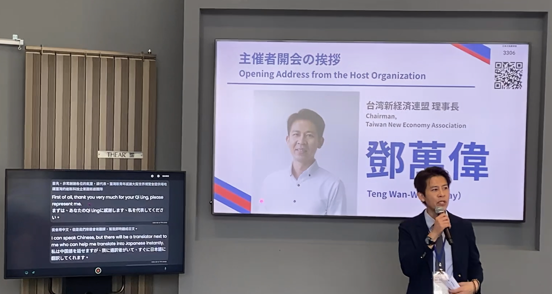 (台灣新經連理事長鄧萬偉在日本大阪世博論壇高峰會與國際記者會致詞,AIspeakin提供中日英三語秒速精準同步翻譯及語譯)